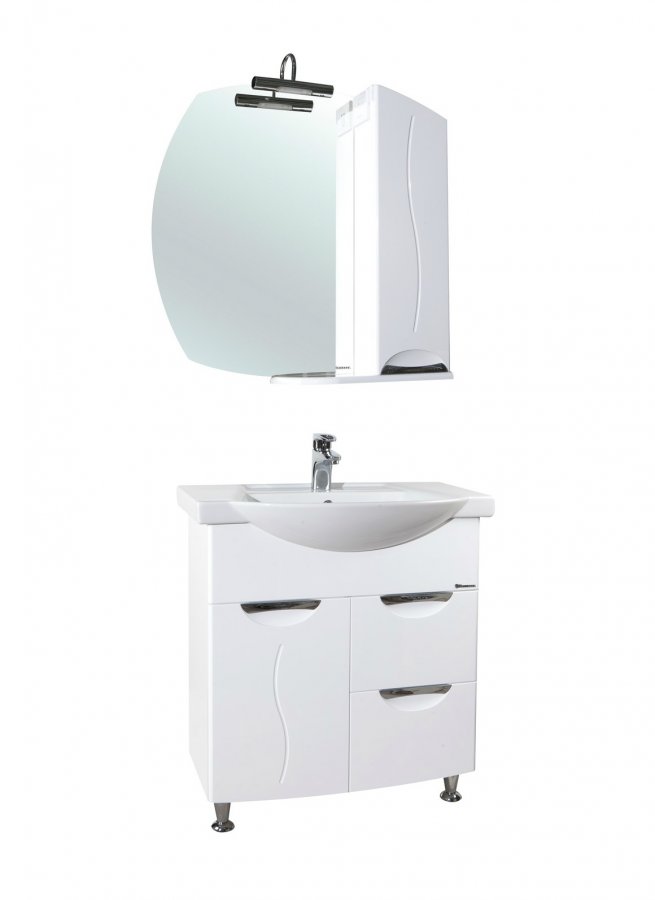 Комплект мебели Bellezza Глория 75 R белый – это безупречный вариант для обустройства небольшой ванной комнаты. Прекрасные белоснежные глянцевые фасады и керамическая раковина облагораживают окружающее пространство чистотой и свежестью. Обладая стильным дизайном и рациональным размещением функциональных элементов, представленная мебель обеспечивает комфорт при эксплуатации и позволяет быстро спрятать от посторонних глаз ежедневные средства гигиены. Комплект оборудован корзиной для белья, установленной в левой половине напольной умывальной тумбы.