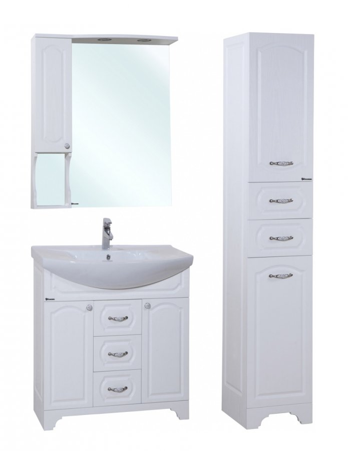 Ценителям классических решений понравится гарнитур Bellezza Камелия 75H L. Его белоснежные МДФ-фасады покрыты защитной ПВХ-плёнкой, которая делает мебель устойчивой к высокой влажности. В комплект входит вместительная тумба с двумя секциями и тремя выдвижными ящиками, которые плавно движутся по шариковым направляющим. Тумба имеет полукруглую раковину из керамики. Встроенная подсветка и розетка настенного зеркала дополнены левосторонним шкафчиком с глухой дверцей, и открытой полкой. Все дверцы гарнитура посажены на петли с доводчиками.