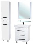 Гарнитур Bellezza Рокко 50 с прочными МДФ-фасадами, покрытыми влагостойкой белоснежной эмалью, идеально впишется в небольшую ванную комнату, расширив ее функциональные возможности. В комплектацию входит напольная тумба с тремя выдвижными ящиками, фаянсовый чешский умывальник Dreja и настенное зеркало без рамы со стеклянной полкой. Высокие прочные ножки тумбы дополнены эргономичным дизайном хромированных ручек на ящике.
