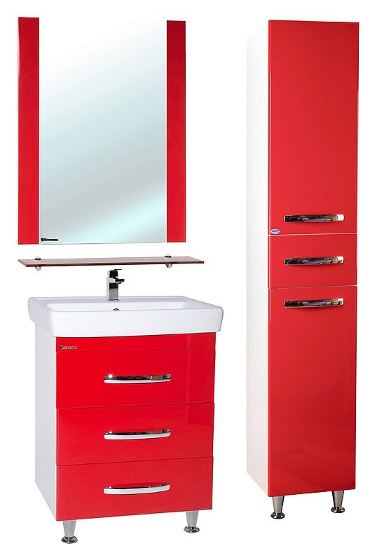 Легкие нотки бунтарства подарит современному интерьеру гарнитур Bellezza Рокко 50, МДФ-фасады которого отделаны сочной красной эмалью. В комплект входит всё необходимое, чтобы сделать помещение комфортабельным: тумба с тремя выдвижными ящиками на высоких устойчивых ножках, прямоугольный умывальник Dreja из чешского фаянса и настенное зеркало со стеклянной полкой. Крепления для нее входят в комплект.