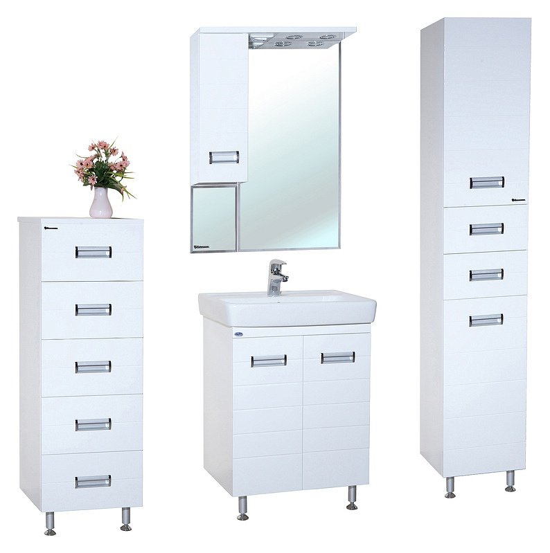 Элегантным и функциональным дополнением современного интерьера ванной комнаты станет гарнитур Bellezza Сиена 50 L. В набор входит напольная тумба на высоких ножках с двумя распашными секциями, прямоугольный умывальник из чешской керамики Dreja и настенное зеркало со встроенной подсветкой и розеткой. Слева от зеркального полотна размещен компактный шкаф. Глянцевые МДФ-фасады покрыты высокопрочной белой эмалью, поэтому им не страшны ни влага, ни удары.